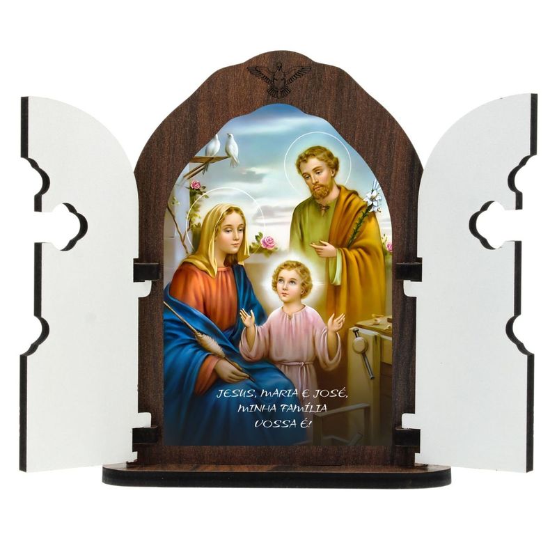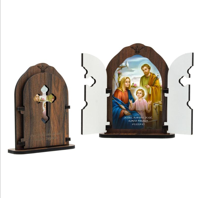 Adorno de Mesa com a imagem da Sagrada Família, com acabamento sofisticado e portas que se abrem. Ideal para oração e decoração.