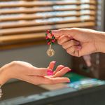Linda dezena com contas em vermelho e verde, cores tradicionais do Natal, formando uma mini guirlanda com a medalha da Sagrada Família em metal. Um presente cheio de fé e significado para celebrar o nascimento de Jesus e abençoar quem você ama.