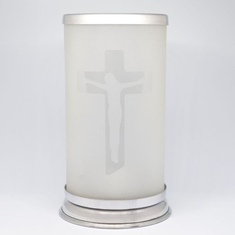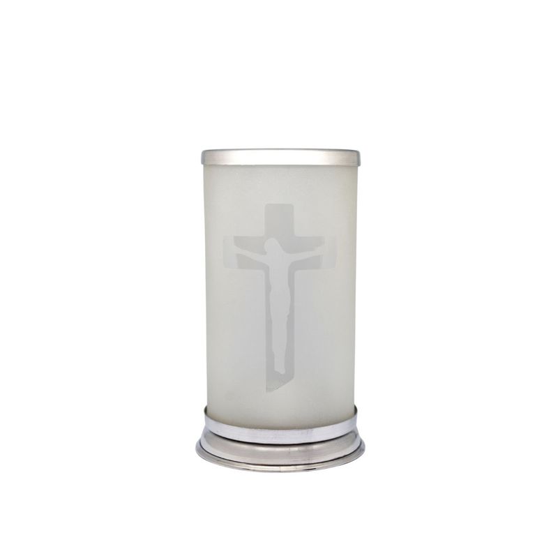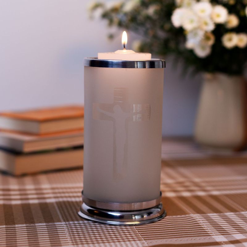 Ideal para momentos de oração, este porta-velas cria um ambiente acolhedor e cheio de fé. A imagem do Crucifixo ilumina o espaço com serenidade e devoção.